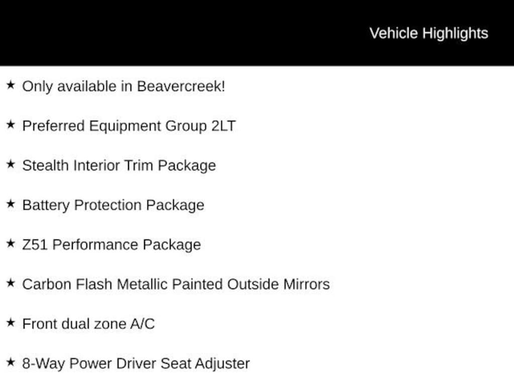 Only available in Beavercreek!, 8-Way Power Driver Seat Adjuster, 8-Way Power Passenger Seat Adjuster, Automatic Leveling System Headlamp Control, Battery Protection Package, Black Exhaust Tips, Bose Performance Series Sound System w/14 Speakers, Carbon Flash Metallic Painted Outside Mirrors, Carbon Flash Metallic-Painted Outside Mirrors, Convertible Top w/Carbon Flash Nacelles & Roof, Driver Power Bolster Seat Adjuster, Edge Red-Painted Calipers, Front dual zone A/C, Front Lift Adjustable Height w/Memory, GT2 Bucket Seats, HD Front & Rear Vision Cameras, Head-Up Display, Heated & Vented Driver & Passenger Seats, Heated Steering Wheel, Heavy-Duty Cooling System, Memory Driver & Passenger Convenience Package, Memory seat, Passenger Power Bolster Seat Adjuster, Performance Data & Video Recorder, Performance Exhaust w/Stainless-Steel Tips, Performance Rear Axle Ratio, Power Driver Lumbar Control Seat Adjuster, Power Passenger Lumbar Control Seat Adjuster, Preferred Equipment Group 2LT, Rear Cross Traffic Alert, Rear Z51 Spoiler, Side Blind Zone Alert, Stealth Interior Trim Package, Universal Home Remote, Wheels: 19 x 8.5 Fr/20 x 11 Rr Bright, Z51 Performance Brakes, Z51 Performance Package, Z51 Performance Suspension.