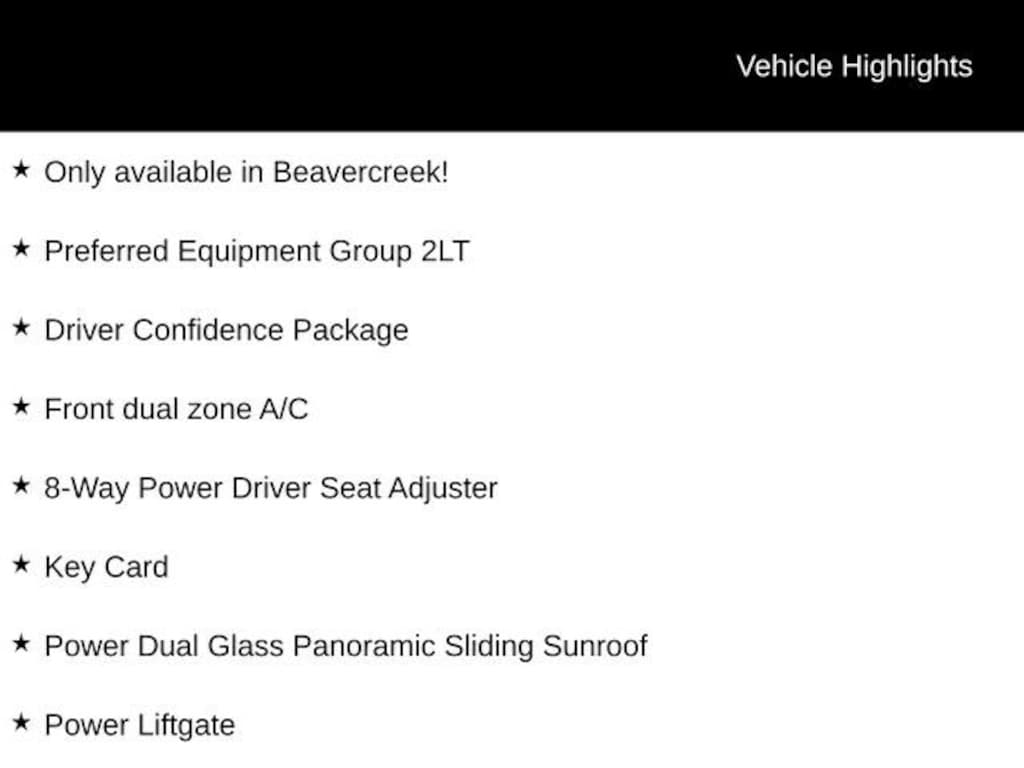 Only available in Beavercreek!, AWD, 8-Way Power Driver Seat Adjuster, Driver Confidence Package, Evotex Seat Trim, Front dual zone A/C, HD Surround Vision, Heated Driver & Front Passenger Seats, Heated steering wheel, Key Card, Power Dual Glass Panoramic Sliding Sunroof, Power Liftgate, Power Outlet, Preferred Equipment Group 2LT, Radio: Audio System w/17.7 Diagonal Display, Rear Camera Mirror, Rear Pedestrian Alert, SiriusXM w/360L Trial Subscription, Sun & Wheel Package, Traffic Sign Recognition, Wheels: 20 Carbon Flash Metallic Aluminum.